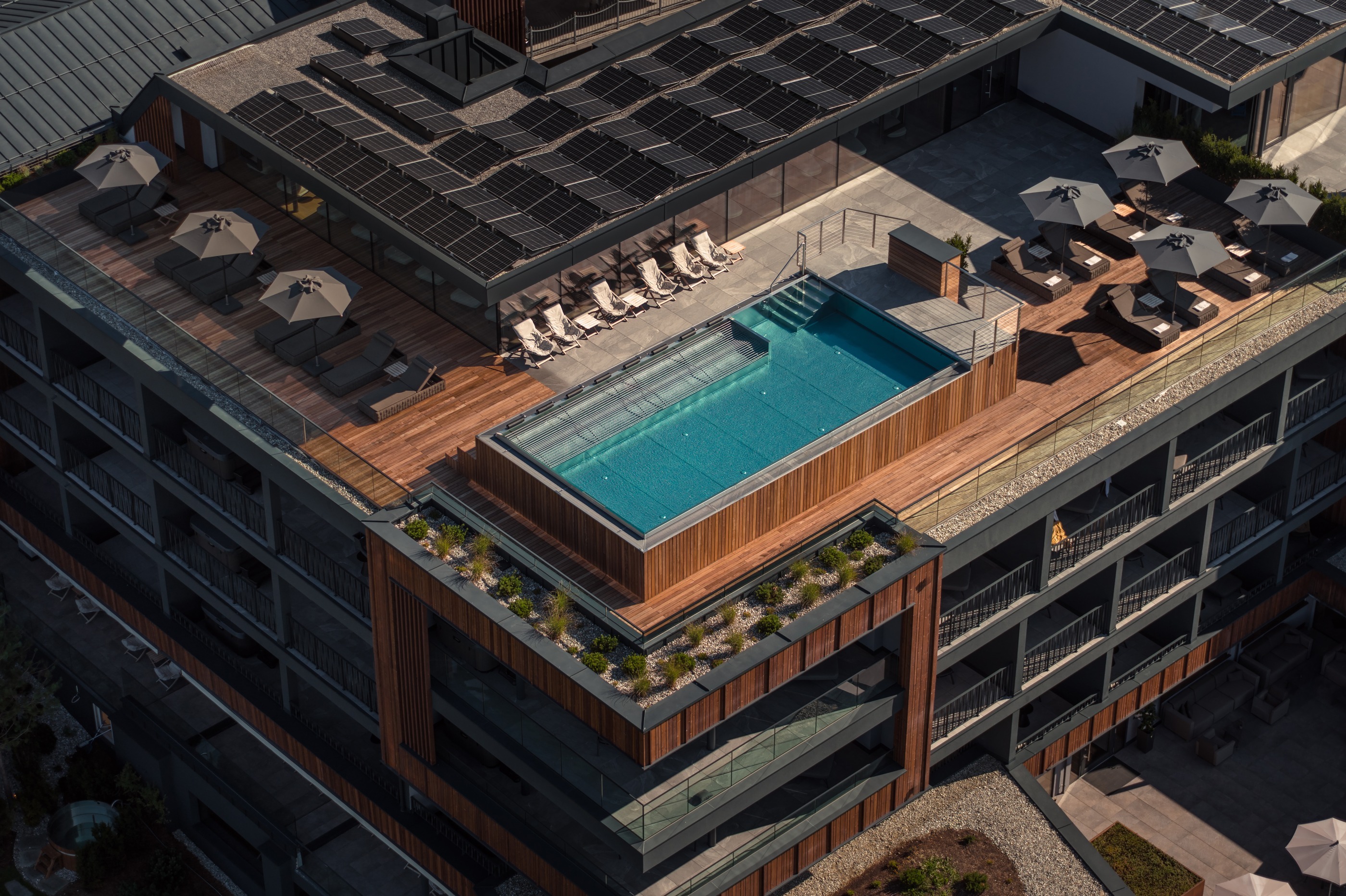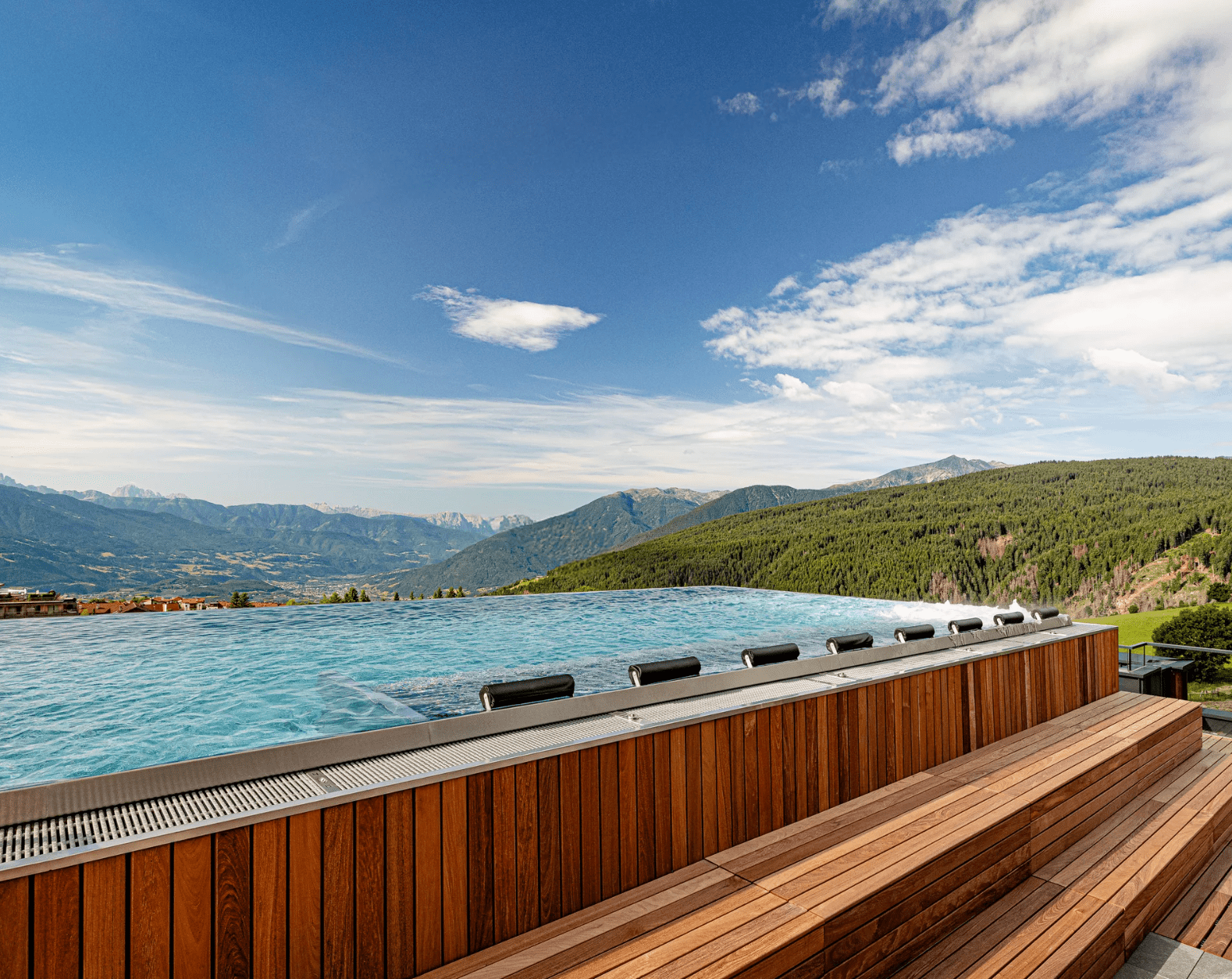 🏊♂️⛰️ 18m Infinity-Pool mit Dolomiten-Blick: Schwimmen Sie dem Horizont entgegen im beheizten Außenpool auf 1.450m Höhe - ein einzigartiges Erlebnis mit Panoramablick auf die majestätischen Dolomitengipfel.